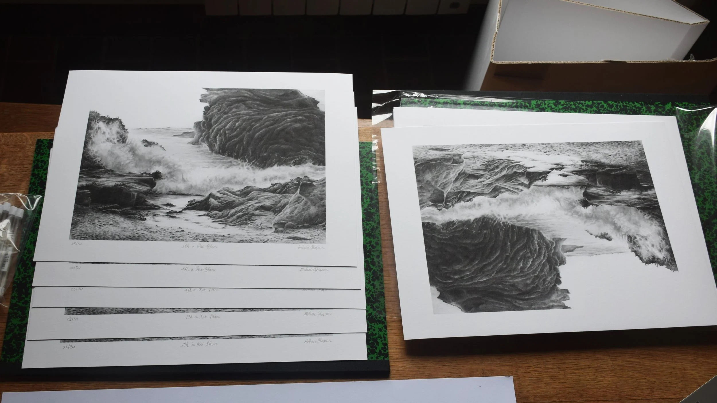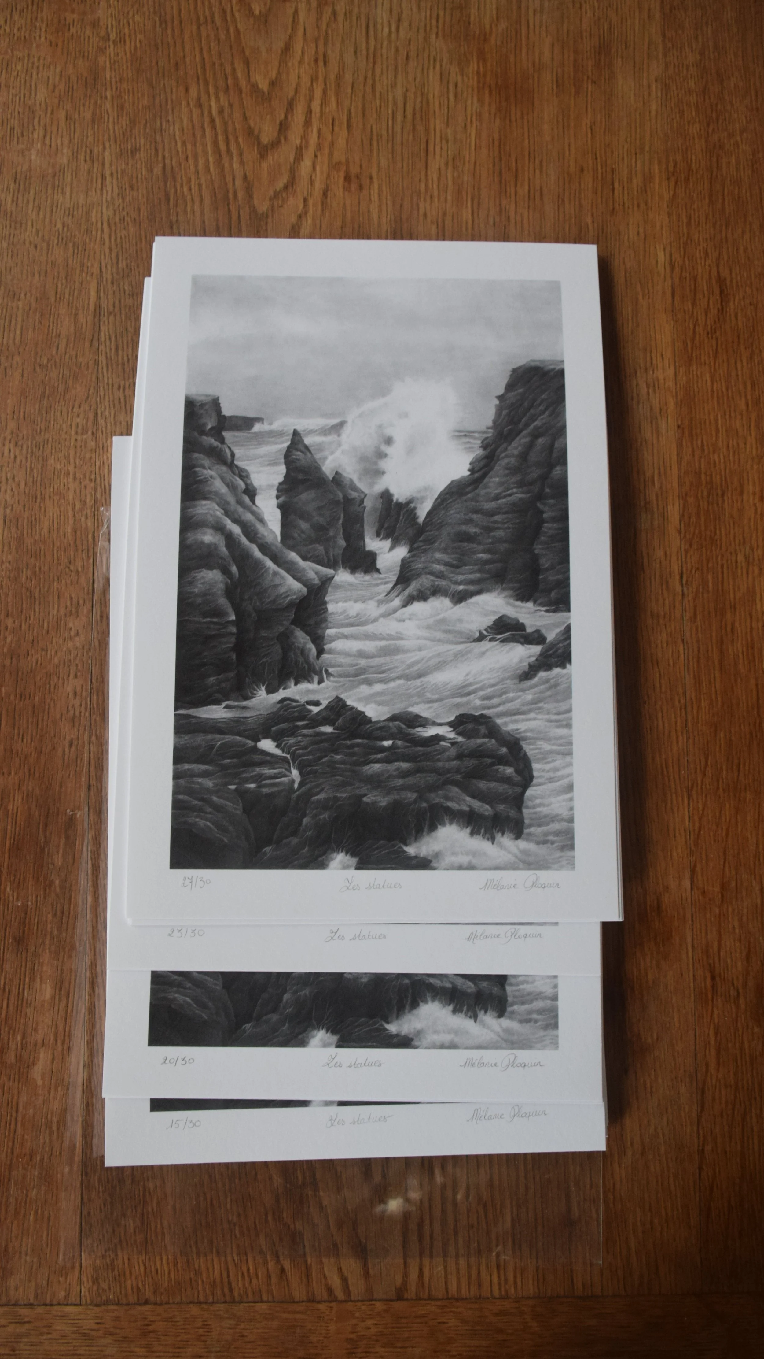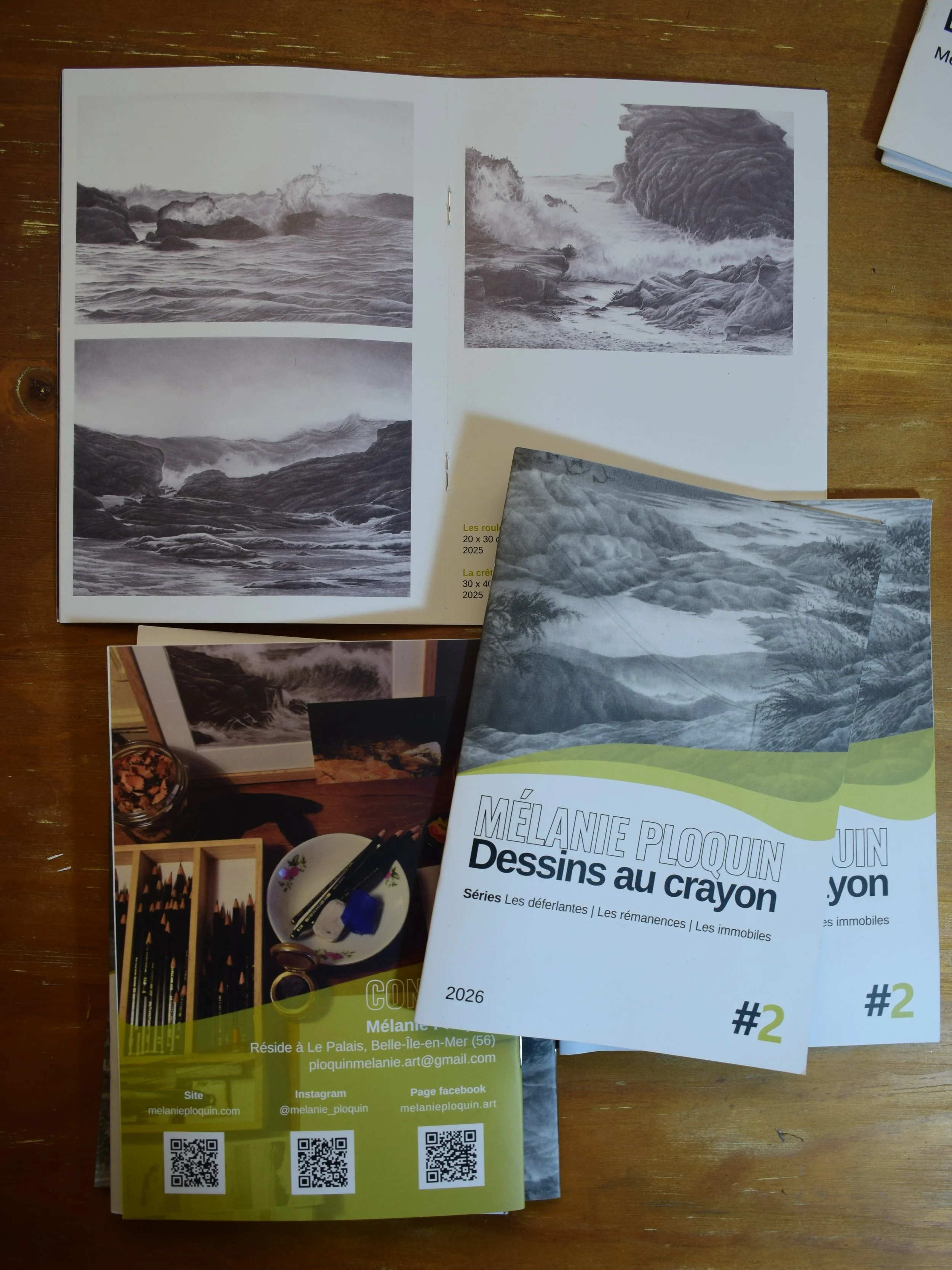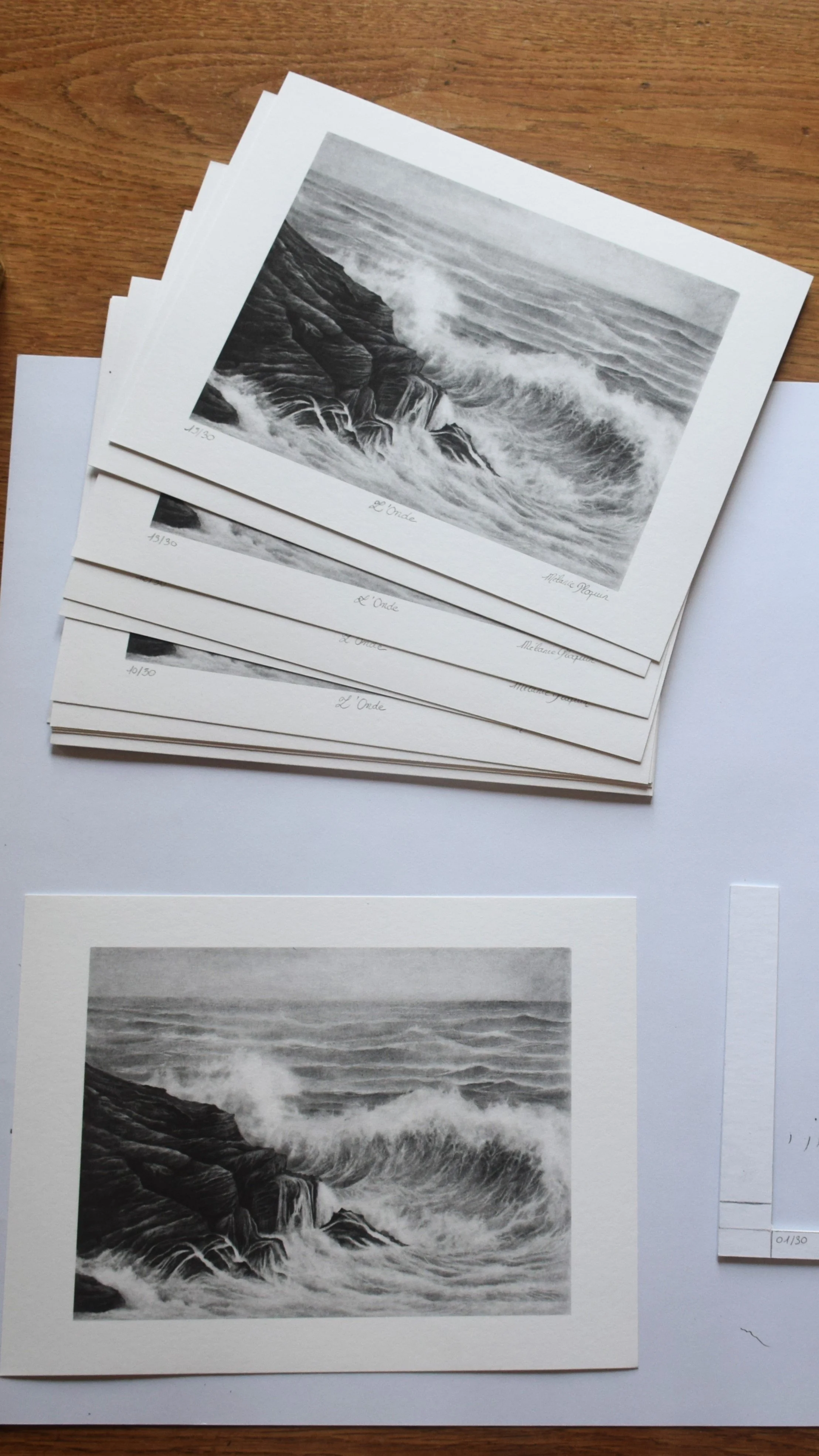 Marcher sur les sentiers côtiers lors de tempêtes ou de grandes marées, c'est contempler un spectacle de mouvements et de lumières. J'essaie de comprendre les déferlantes en les dessinant : leurs retombées, leurs ampleurs, leurs poésies (…)