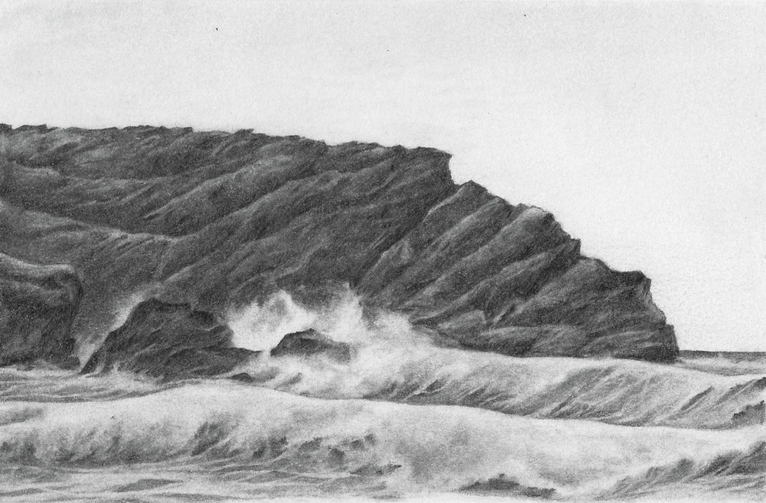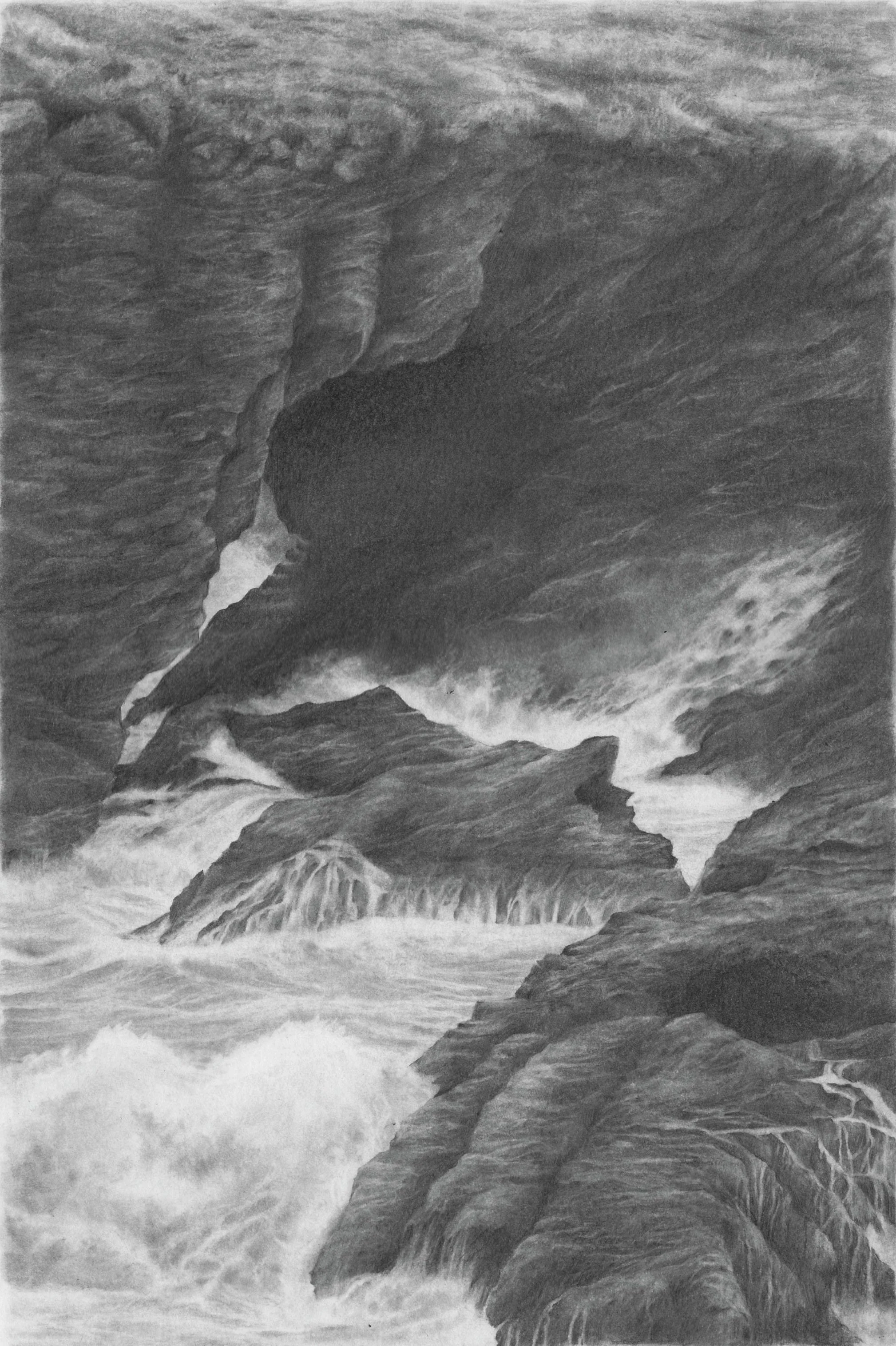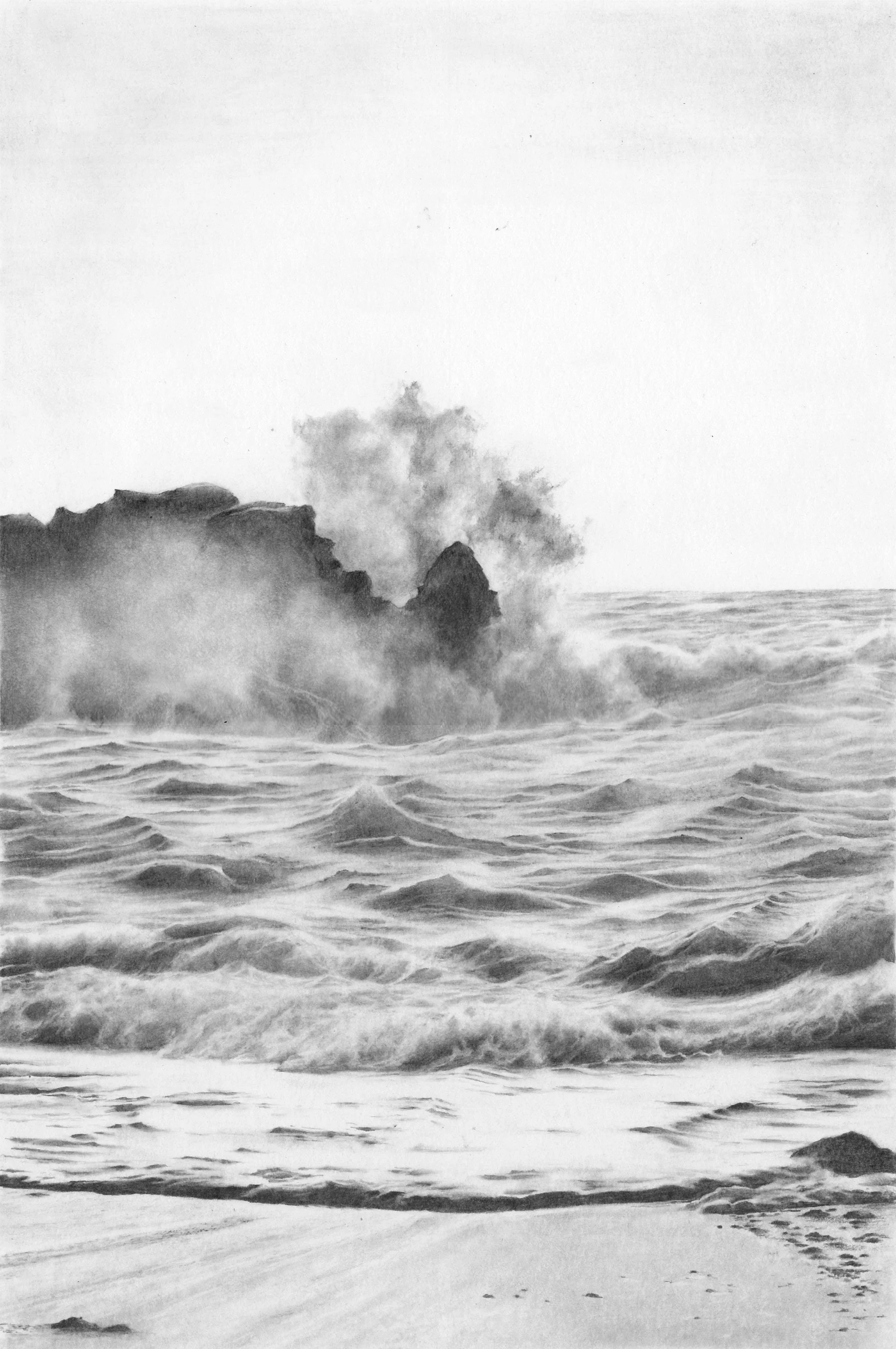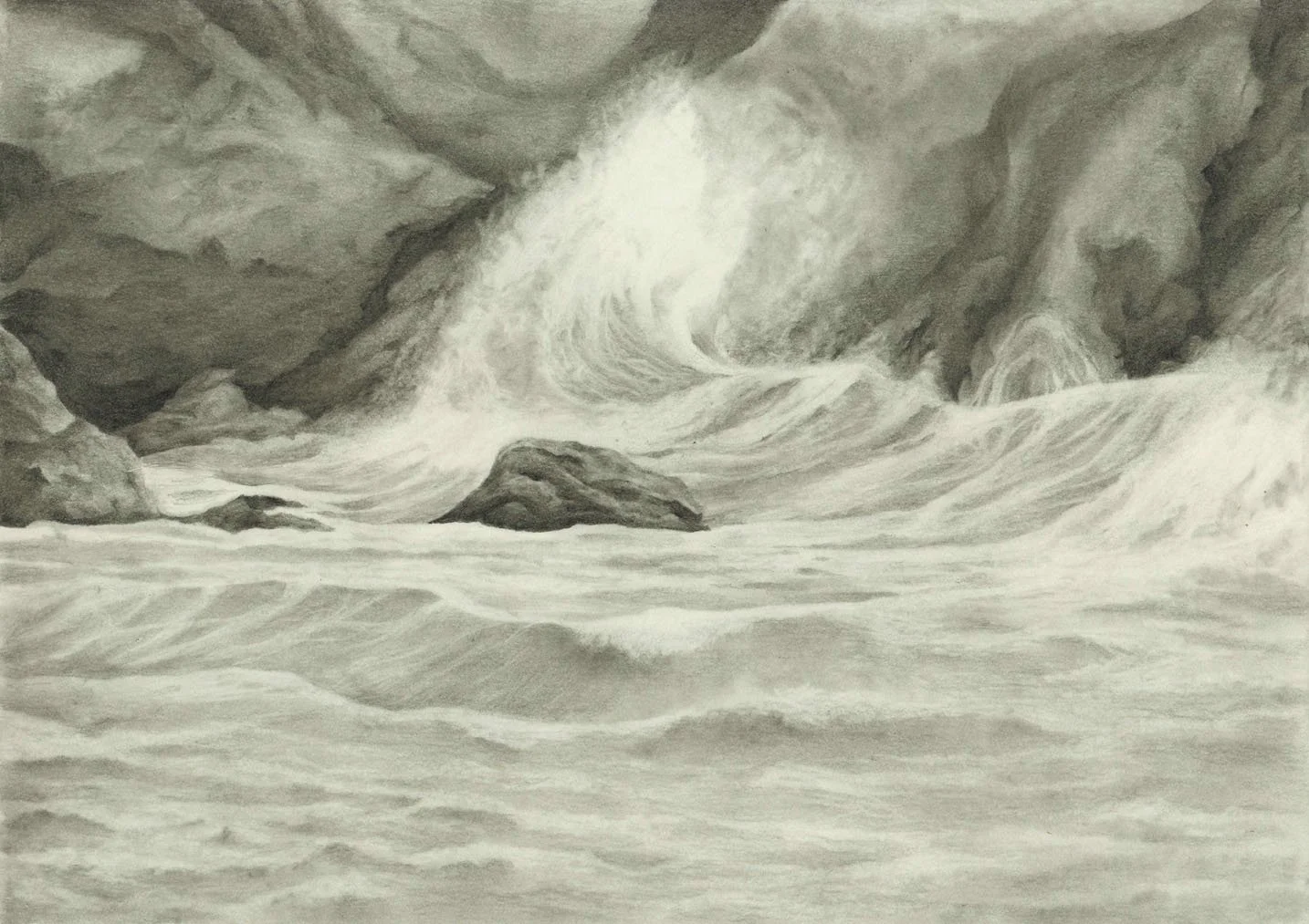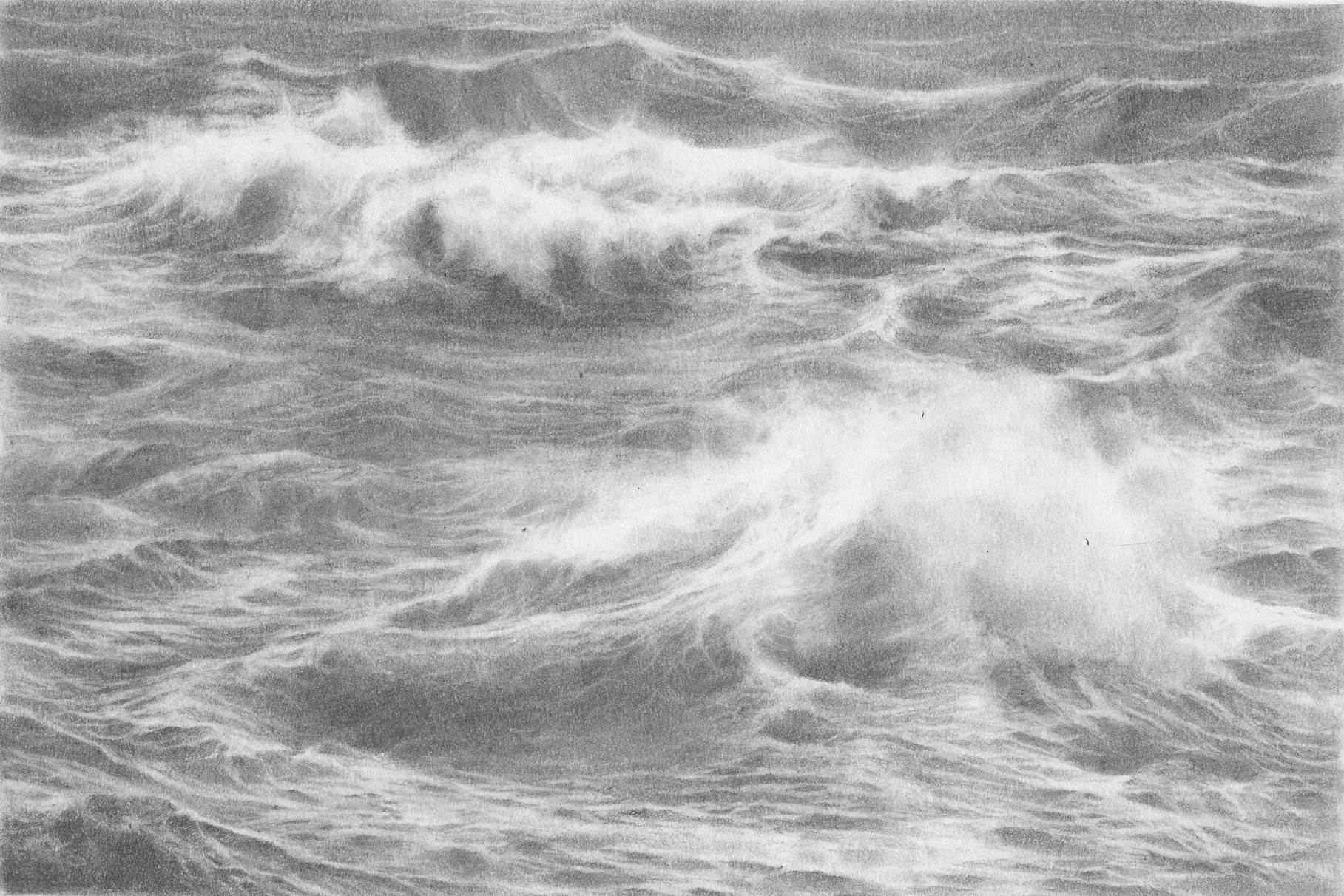 Marcher sur les sentiers côtiers lors de tempêtes ou de grandes marées, c'est assister à un spectacle unique de mouvements et de lumières. Capturer en photographie le fracas des vagues contre la roche est un jeu intarissable et universel. J'essaie de comprendre les déferlantes en les dessinant : leurs retombées, leurs ampleurs, leurs poésies. Tracer les squelettes des vagues, les ossatures des roches, les nervures des courants est une vaine tentative d'apprivoiser ce qui nous échappe. Entourée des vagues et d'une multitude images de mer, j'ai ressenti à mon tour le désir de constituer ma propre collection de déferlantes dans la lignée de ces représentations romantiques qui tapissent les murs des maisons belliloises