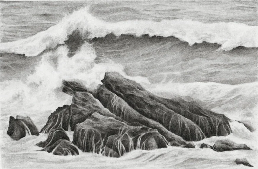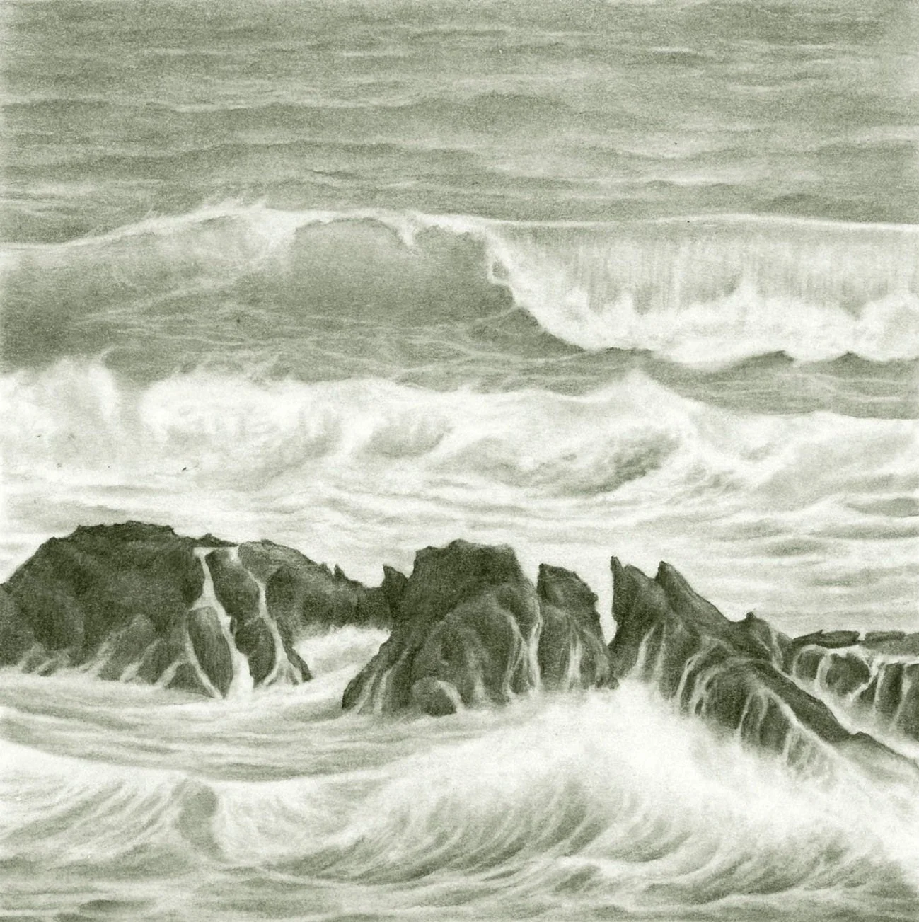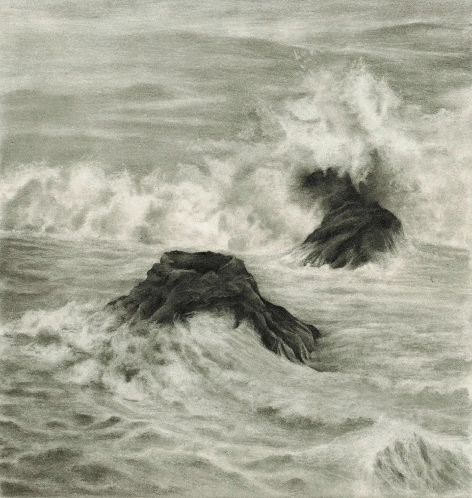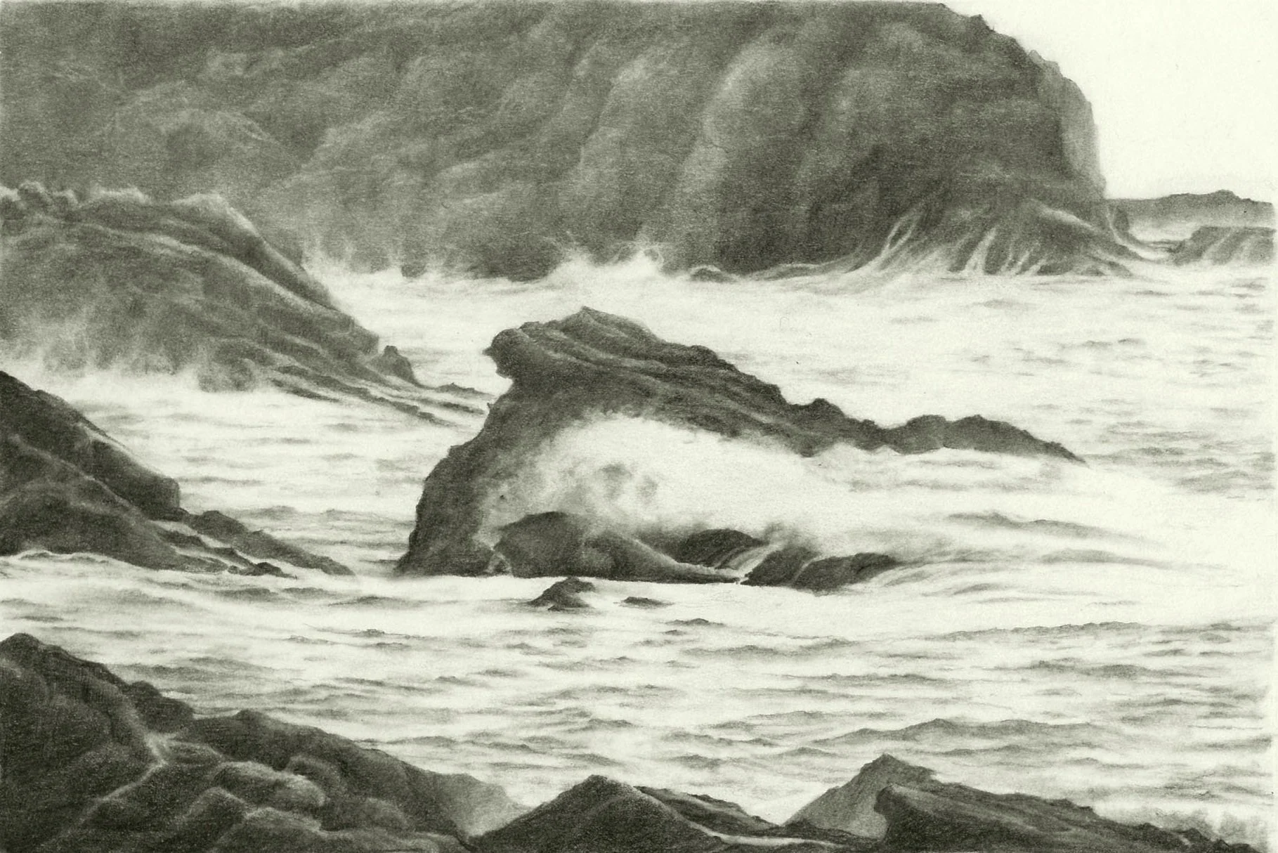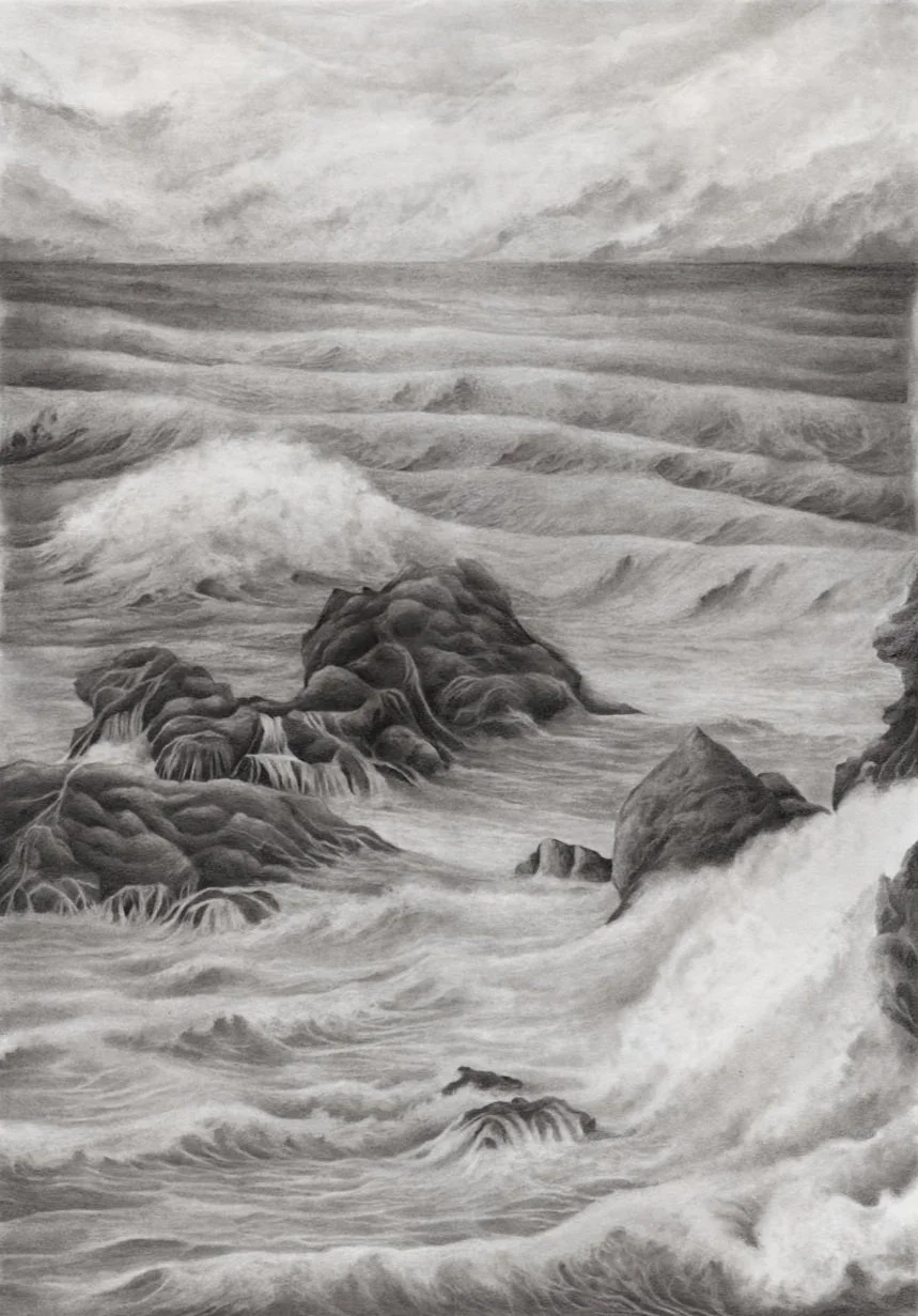Marcher sur les sentiers côtiers lors de tempêtes ou de grandes marées, c'est assister à un spectacle unique de mouvements et de lumières. Capturer en photographie le fracas des vagues contre la roche est un jeu intarissable et universel. J'essaie de comprendre les déferlantes en les dessinant : leurs retombées, leurs ampleurs, leurs poésies. Tracer les squelettes des vagues, les ossatures des roches, les nervures des courants est une vaine tentative d'apprivoiser ce qui nous échappe. Entourée des vagues et d'une multitude images de mer, j'ai ressenti à mon tour le désir de constituer ma propre collection de déferlantes dans la lignée de ces représentations romantiques qui tapissent les murs des maisons belliloises
