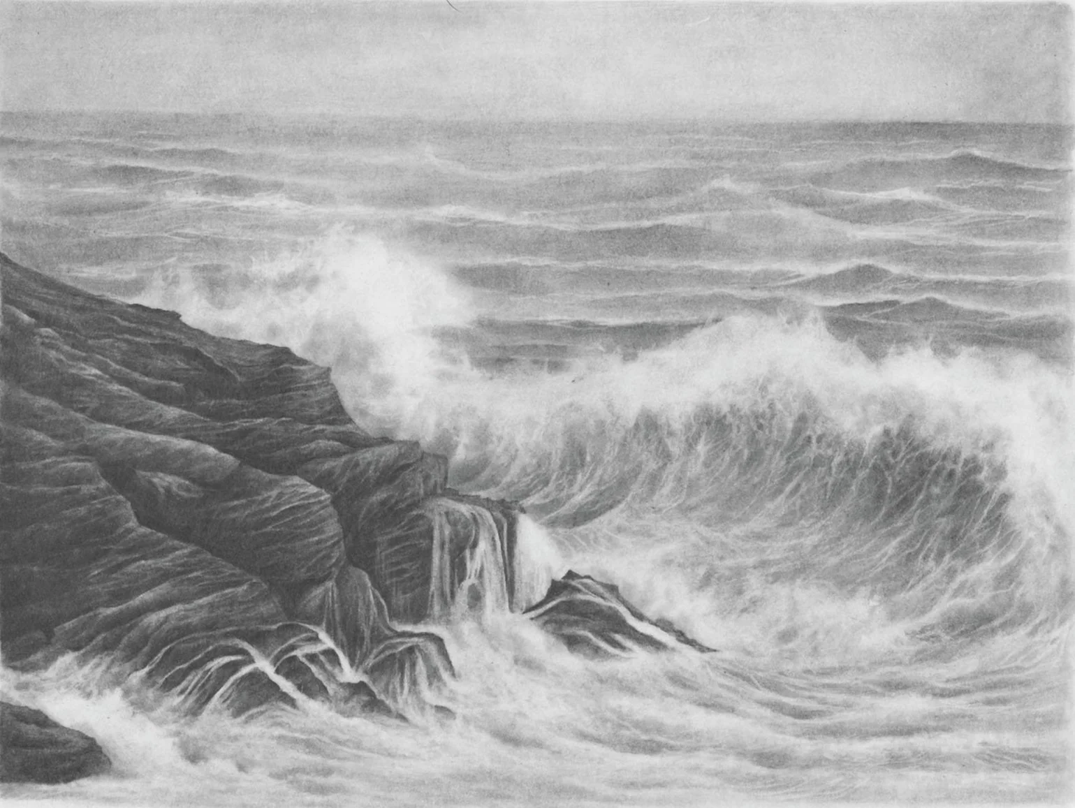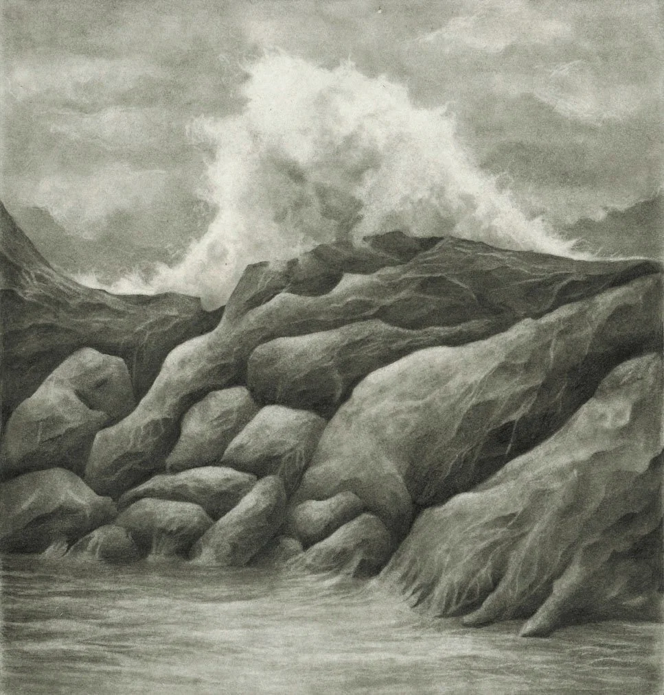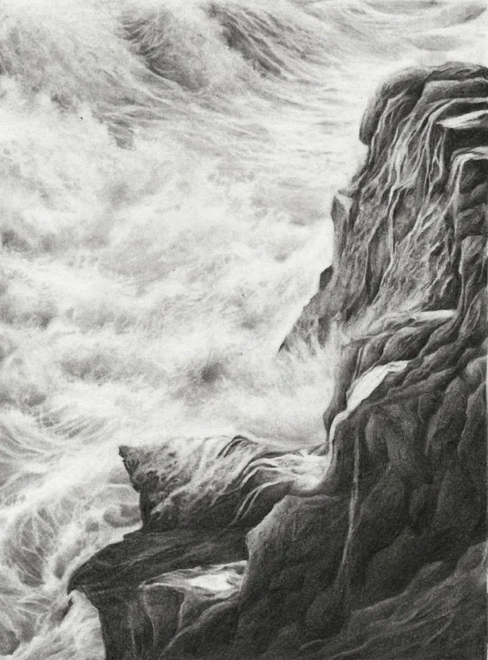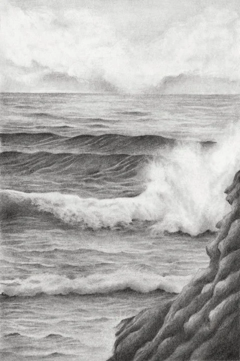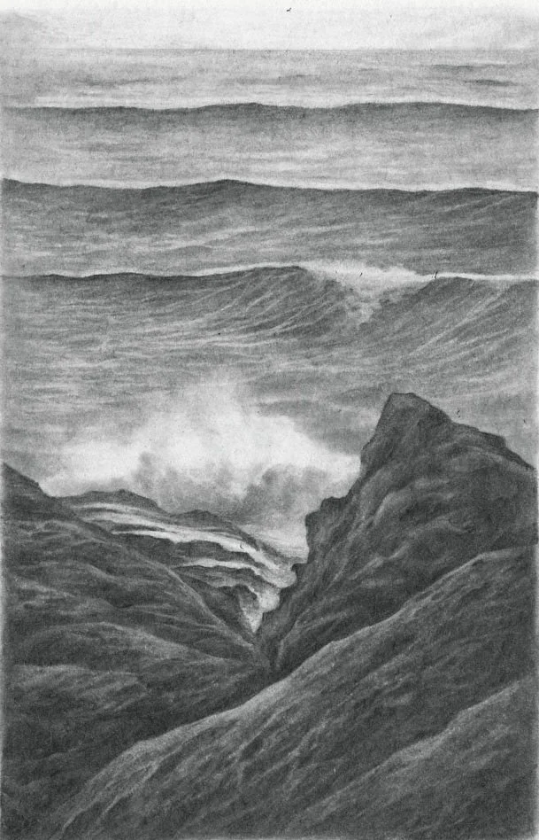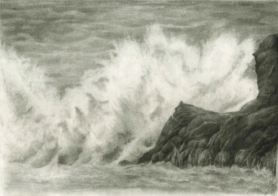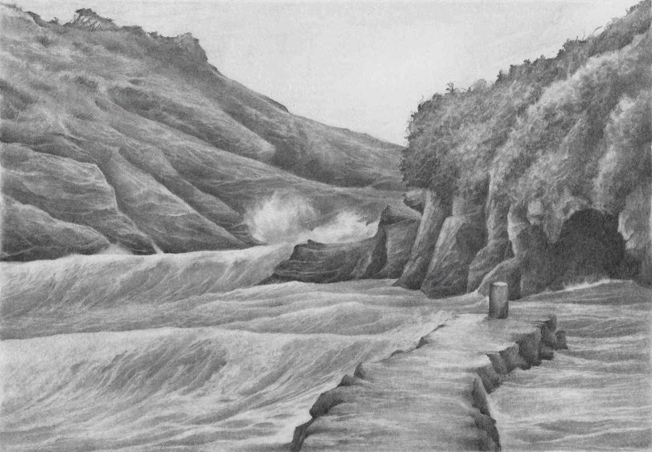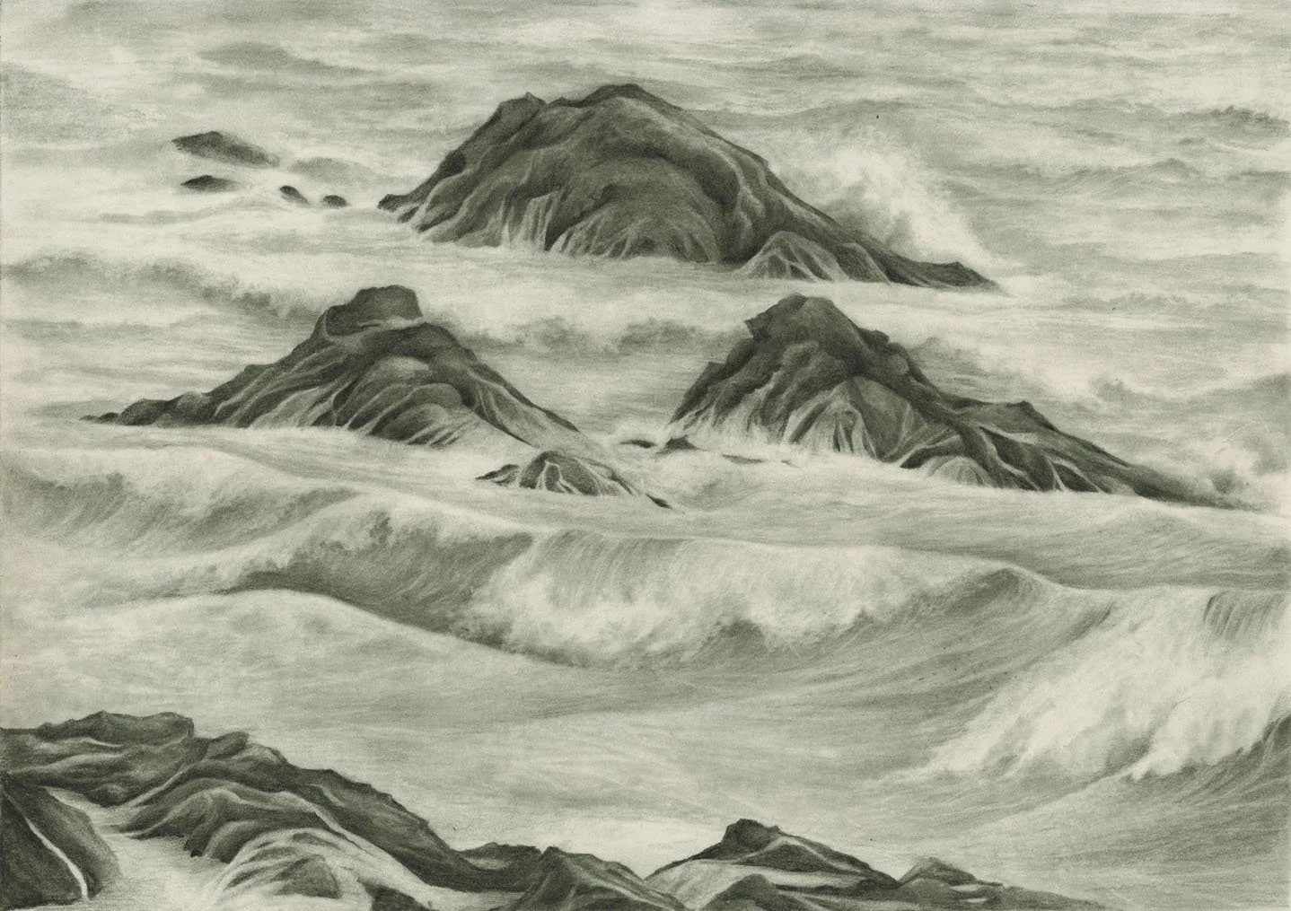 Marcher sur les sentiers côtiers lors de tempêtes ou de grandes marées, c'est assister à un spectacle unique de mouvements et de lumières. Capturer en photographie le fracas des vagues contre la roche est un jeu intarissable et universel. J'essaie de comprendre les déferlantes en les dessinant : leurs retombées, leurs ampleurs, leurs poésies. Tracer les squelettes des vagues, les ossatures des roches, les nervures des courants est une vaine tentative d'apprivoiser ce qui nous échappe. Entourée des vagues et d'une multitude images de mer, j'ai ressenti à mon tour le désir de constituer ma propre collection de déferlantes dans la lignée de ces représentations romantiques qui tapissent les murs des maisons belliloises