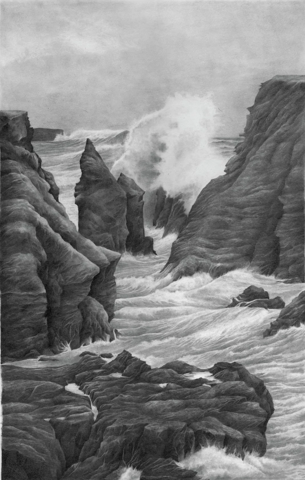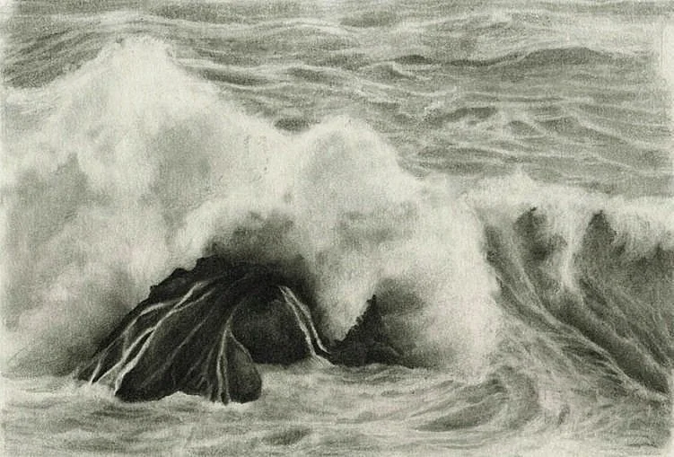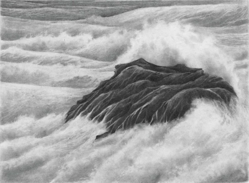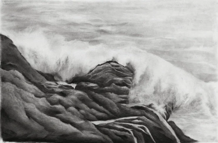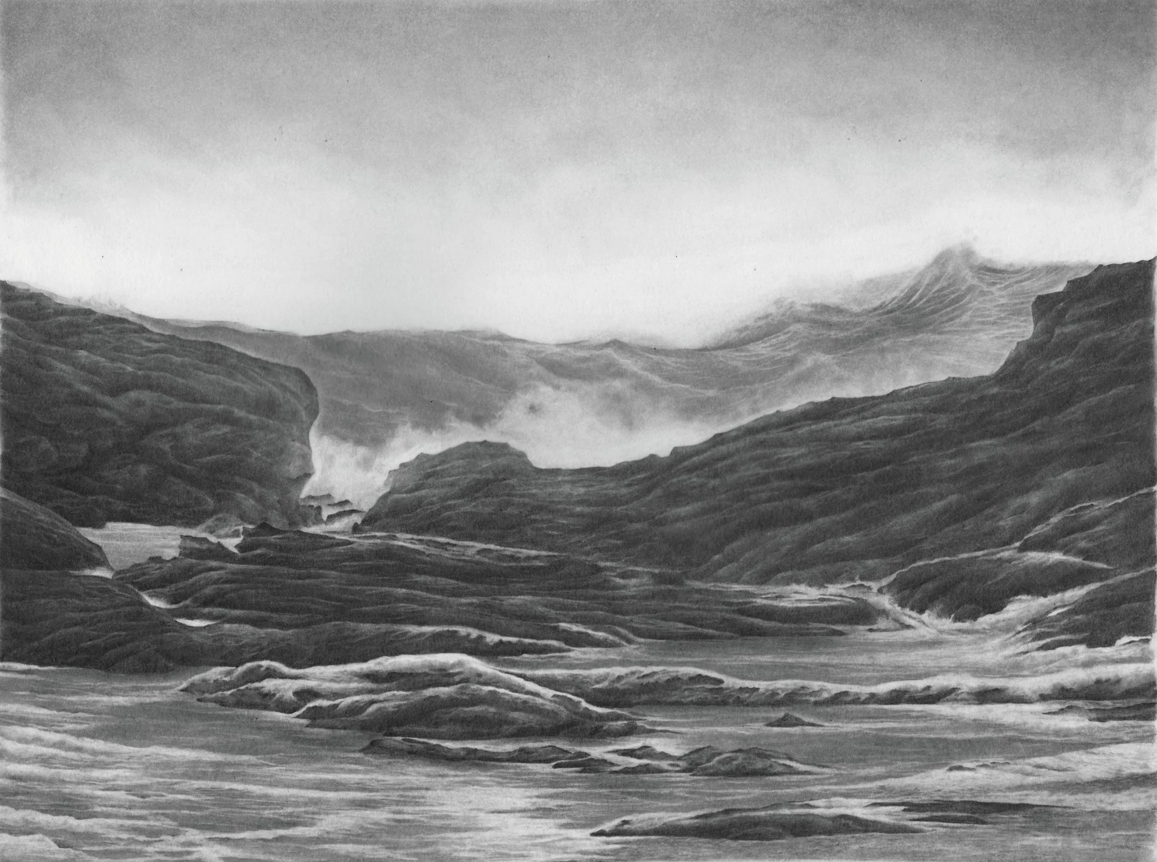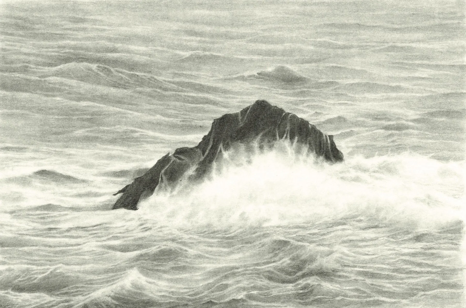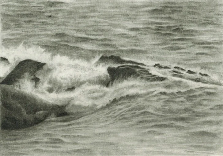 Marcher sur les sentiers côtiers lors de tempêtes ou de grandes marées, c'est assister à un spectacle unique de mouvements et de lumières. Capturer en photographie le fracas des vagues contre la roche est un jeu intarissable et universel. J'essaie de comprendre les déferlantes en les dessinant : leurs retombées, leurs ampleurs, leurs poésies. Tracer les squelettes des vagues, les ossatures des roches, les nervures des courants est une vaine tentative d'apprivoiser ce qui nous échappe. Entourée des vagues et d'une multitude images de mer, j'ai ressenti à mon tour le désir de constituer ma propre collection de déferlantes dans la lignée de ces représentations romantiques qui tapissent les murs des maisons belliloises
